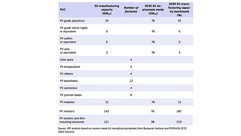 This table from the CETO report shows the EU solar PV manufacturing benchmark for 2030 for specific Primarily Used Components (PUCs) for PV, which will not be enough to meet the bloc’s own targets except for inverters and trackers, along with their mounting structures. (Photo Credit: Clean Energy Technology Observatory, European Commission)