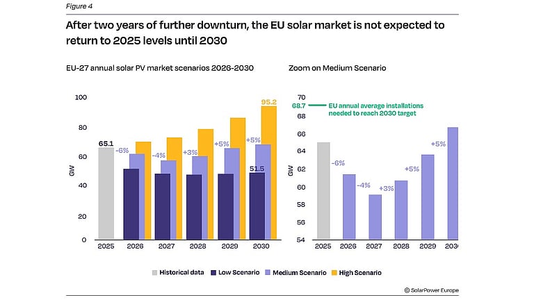 In the latest edition of the EU Solar Market Outlook 2025-2030, SPE says the bloc needs to add an average of 68.7 GW annually to reach the 2030 solar target of 750 GW. However, analysts expect 2 more years of decline, anticipating a 6% YoY drop in installations in 2026, 4% in 2027, before picking up with a 3% increase in 2028.