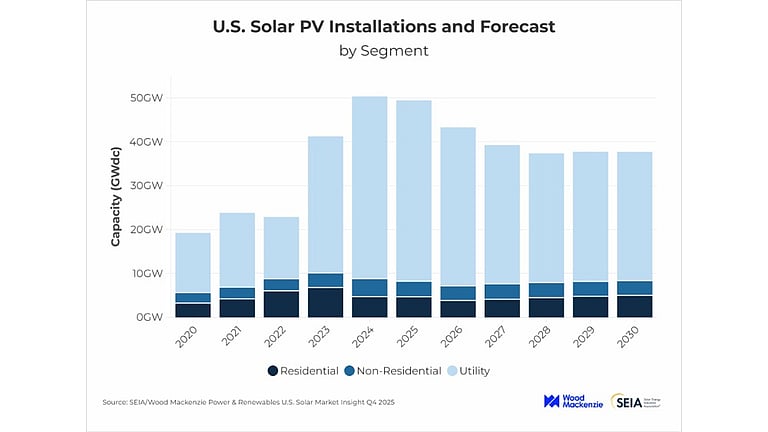 The SEIA and Wood Mackenzie report forecasts 246 GW DC of solar PV additions in the US between 2025 and 2030, less than its full potential. A lot depends on clearer federal permitting rules and FEOC guidance. (Photo Credit: SEIA/Wood Mackenzie)